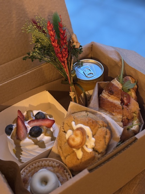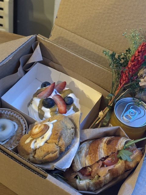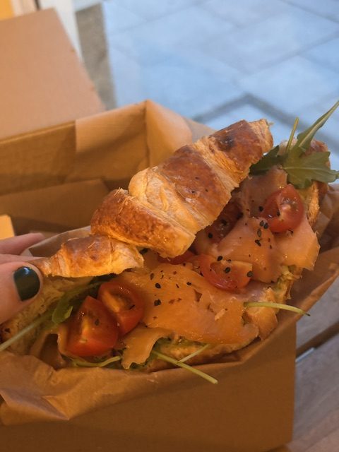Croissant salado con crema de agucate, salmón, rúcula y cherries
